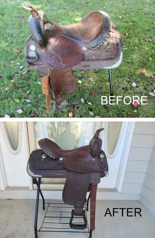 Deep clean, oil, and condition. Safety inspection included for all services. Excessive ground in dirt, plating, suede knee rolls, etc. all may increase rates. Estimate provided during initial consult. 50% deposit required at drop off. Remainder required at pickup.