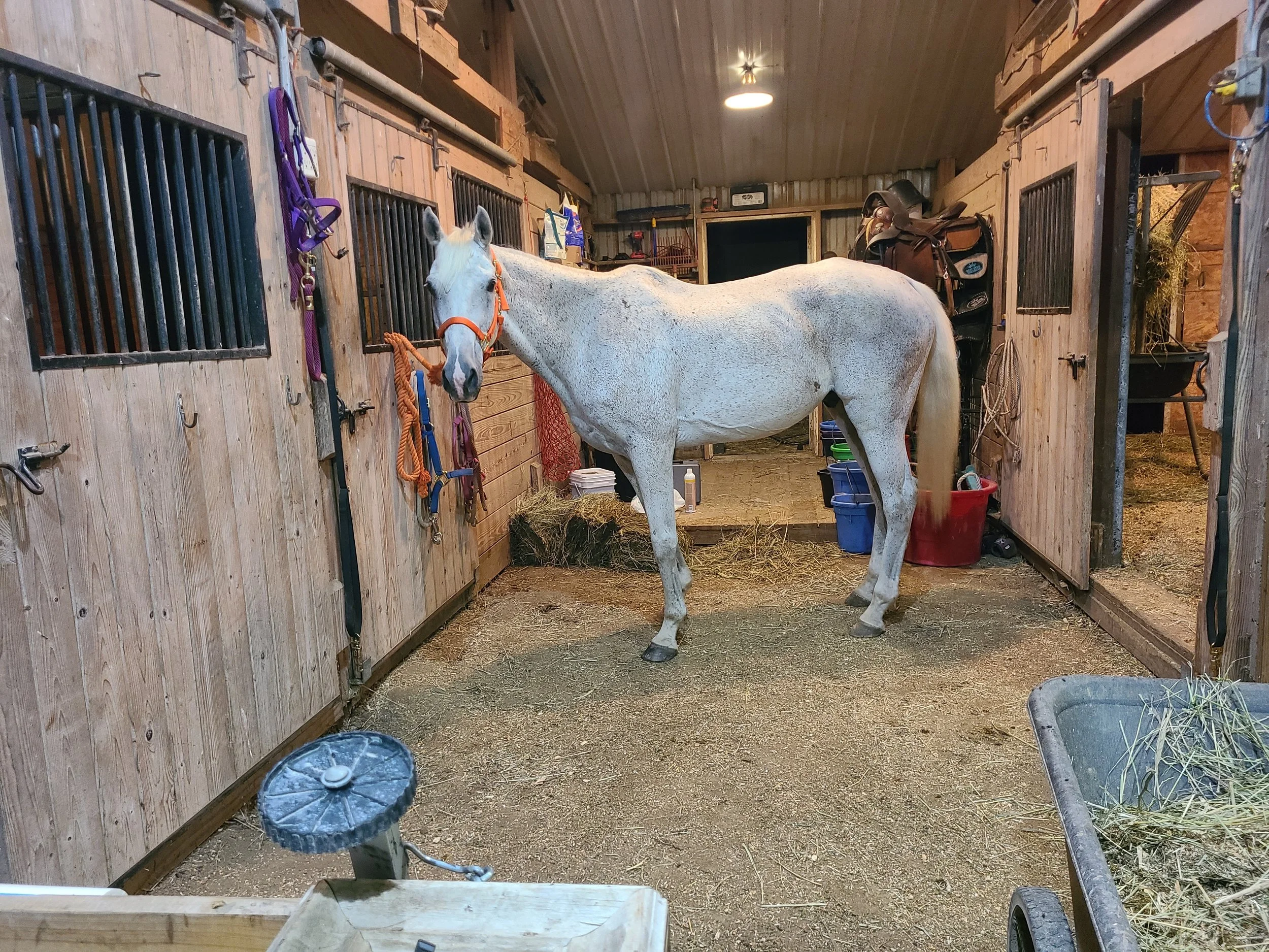 Casper is an approximately 22yo gray TB gelding. Stands about 16-16.1hh. Broke, gentle, great ground manners. Came to us very thin, still putting on weight, so have only started lightly riding again. A bit rusty under saddle, but no buck, bite, bolt, or rear. Might not be suitable for a timid first time rider with his big, floaty gaits, but absolutely no meanness to this guy. Loads, lunges, ties, bathes, clips, stands for vet/farrier, etc. Has as tattoo but can’t make it out. Great for leadline rides, heading down the trail, or ponying colts.